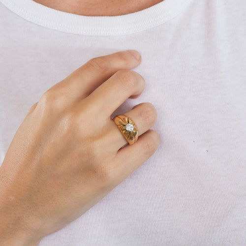 Bangle ring in 18K (750 thousandths) yellow gold and white gold with a gadrooned and chiseled motif centered with an old-cut diamond weighing approximately 0.20 carat, bezel-set.