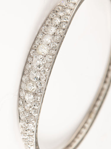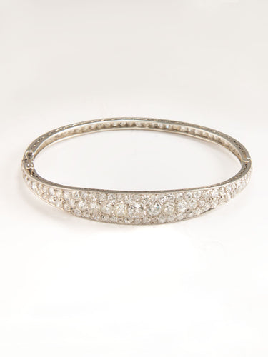 Bangle bracelet in platinum set with old cut diamonds. The clasp has a safety ratchet.
