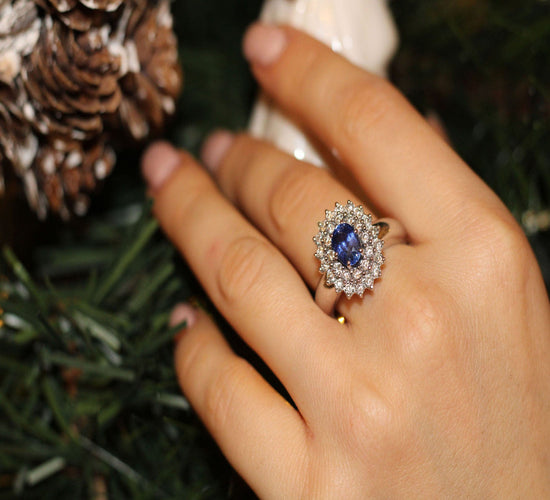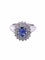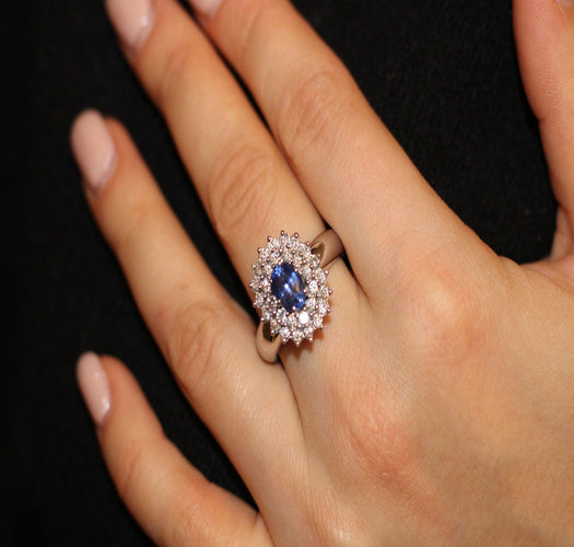 A sublime 18-karat white gold ring centered with an oval-cut blue sapphire, surrounded by brilliant diamonds.