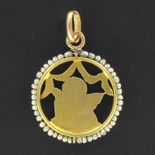 - Circular-shaped medal representing a cherub, bordered with fine pearls.