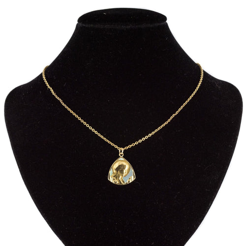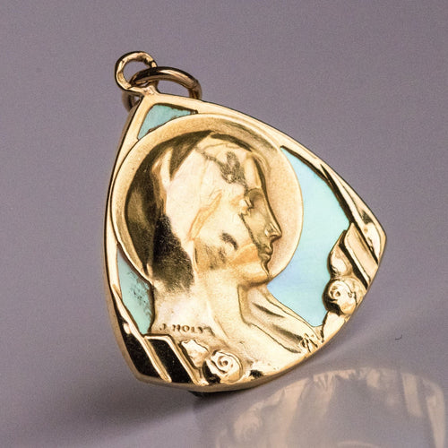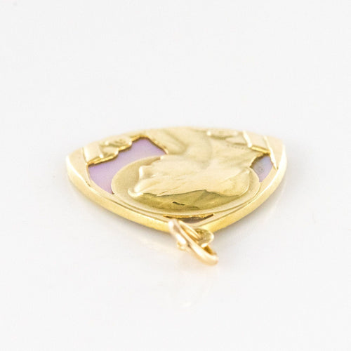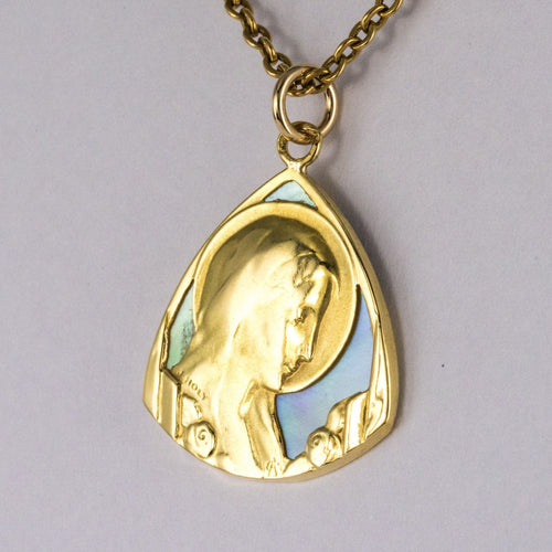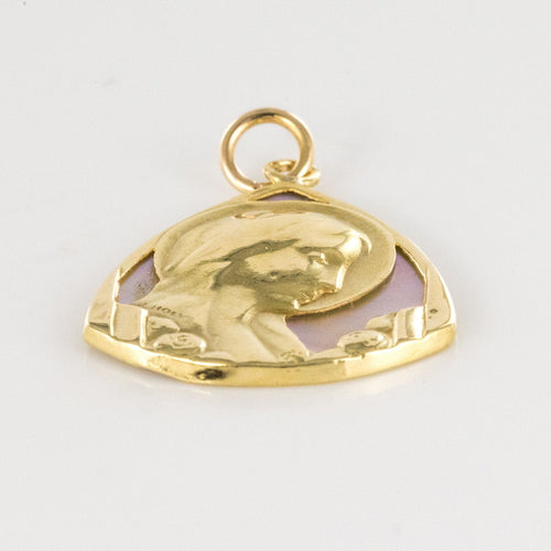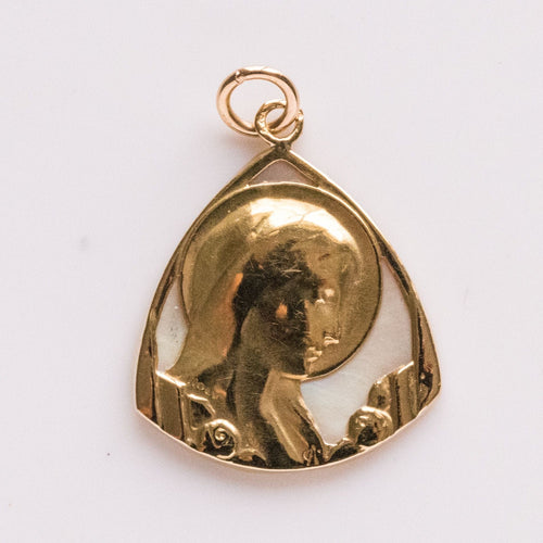 Yellow gold medal, 750 thousandths, 18 carats, eagle's head hallmark. Lovely charming mother-of-pearl medal, it represents the Virgin haloed in gold as well as a decoration made up of roses on the lower part.