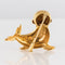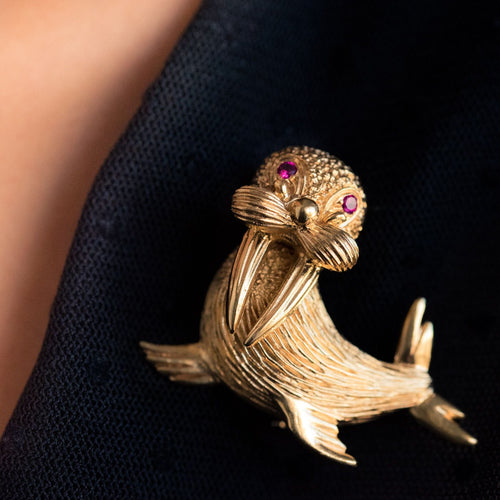 "Bestiary" type brooch representing a walrus whose eyes are set with small synthetic rubies (common at the time) and whose body is in textured yellow gold. The pin has a pump safety device to prevent possible loss of the jewelry.