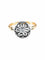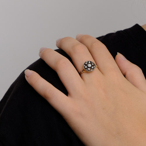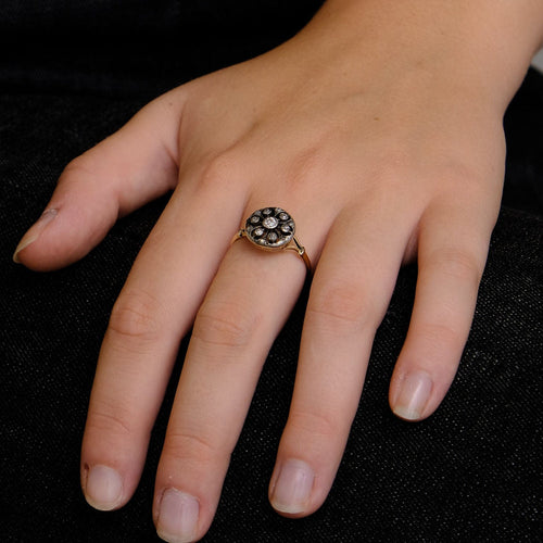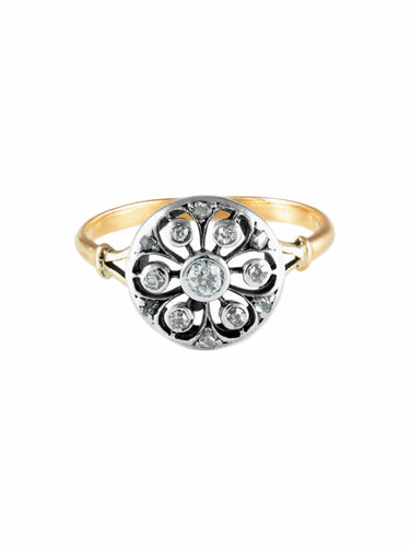 Old ring in 750/1000 yellow gold and silver massive Rosette model, Louis Philippe style. The ring plate is made of silver, the body of the ring is in yellow gold, bezel-set in the center with a very white old-cut diamond of 0.10ct, and 6 old-cut diamonds weighing 0.12ct.