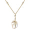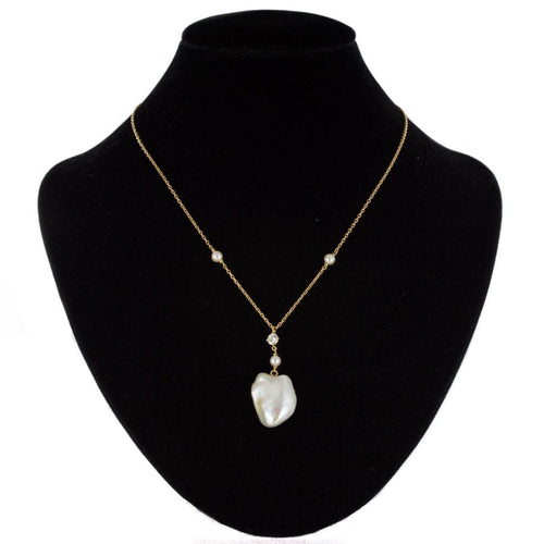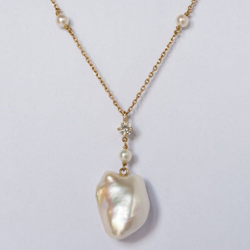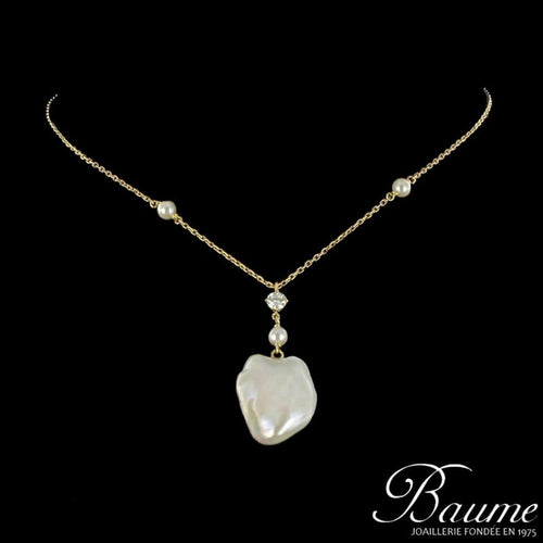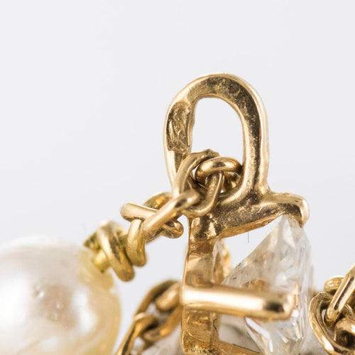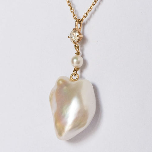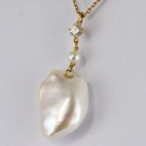New diamond pearl necklace. Pendant and its chain in yellow gold, 750/1000th, 18 carats, eagle's head hallmark. This pearl diamond pendant is made up of a brilliant-cut diamond set with claws which holds a tassel of an orient white cultured pearl then a large baroque orient white pearl. The chain is a cable link.
