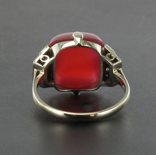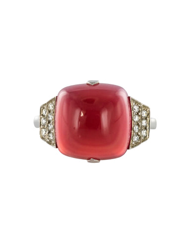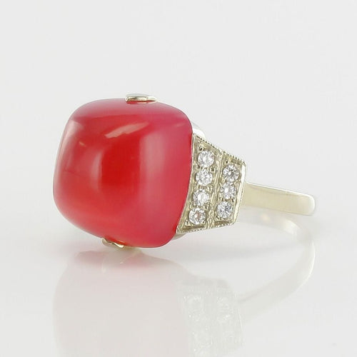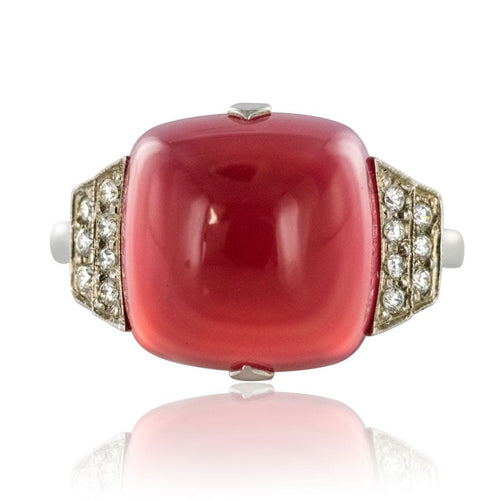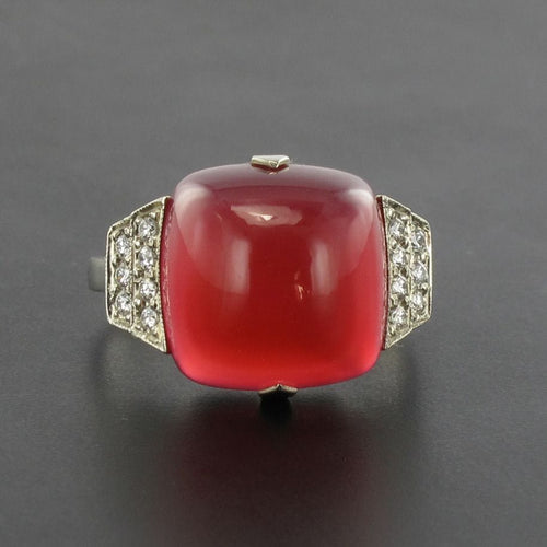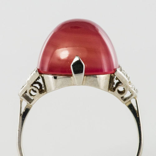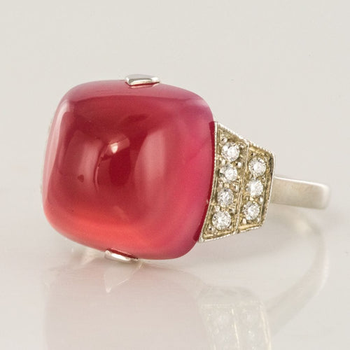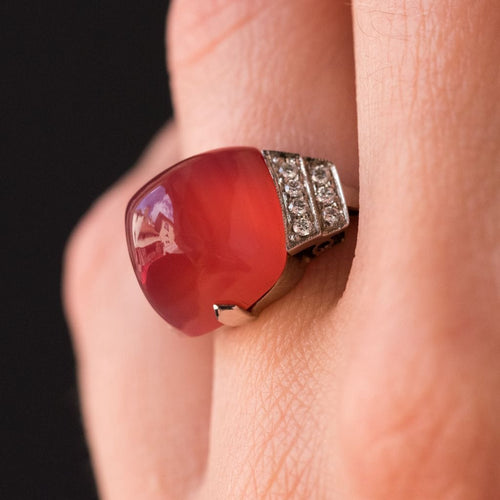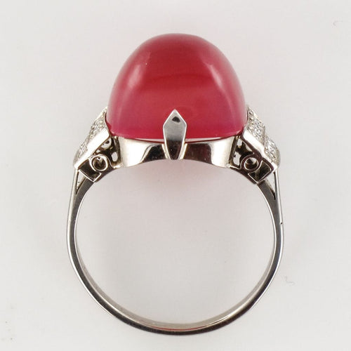 - Inheriting lines Art Deco, this luminous ring is set with 4 flat claws with a chalcedony cabochon shouldered on either side on a staircase decoration of modern brilliant-cut diamonds.