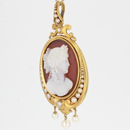 Pendant in yellow gold, 750 thousandths, 18 carats. Stunning cameo antique with an elegant engraving on chalcedony, it is set on a satin yellow gold pendant set with a drop of fine half-pearls on either side. 3 fine pearls are suspended in a tassel. The thick bail is also set with fine falling pearls. The back is engraved with the initials ML.