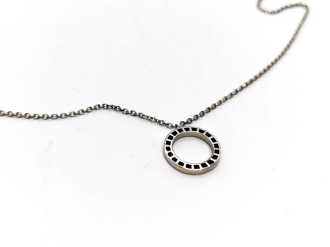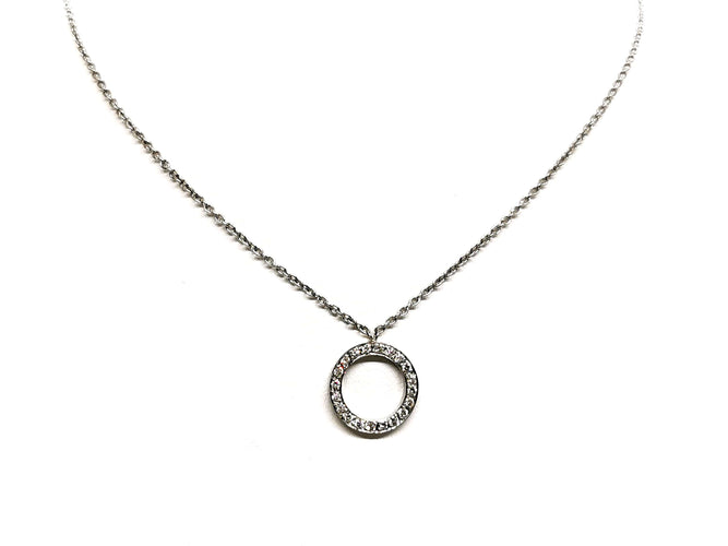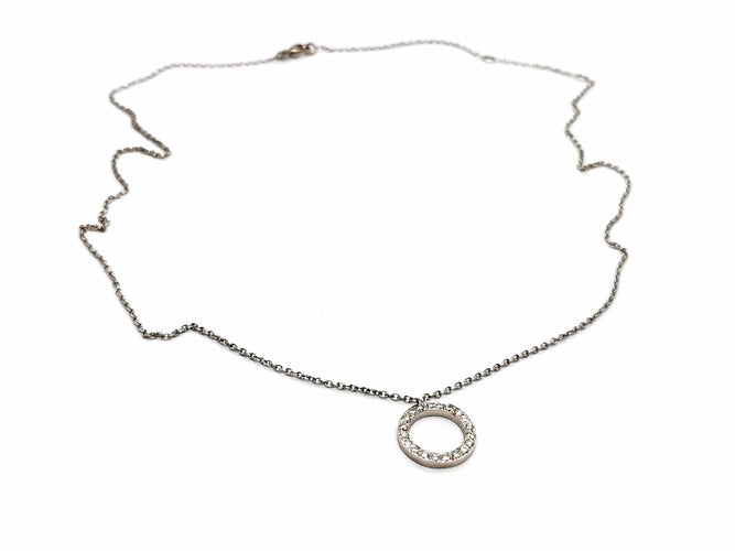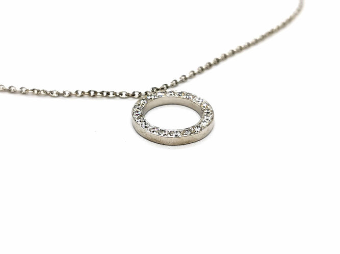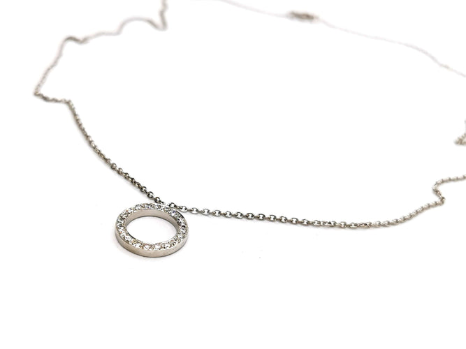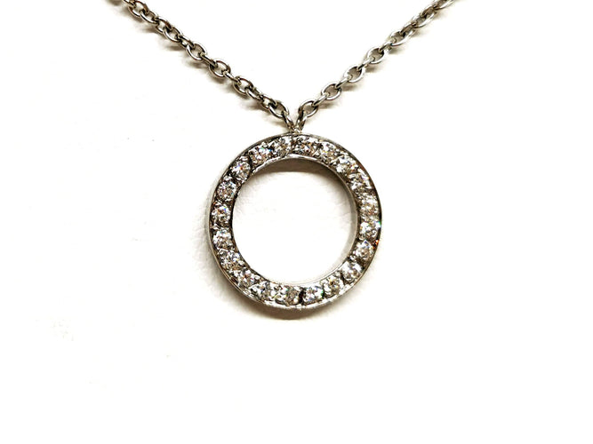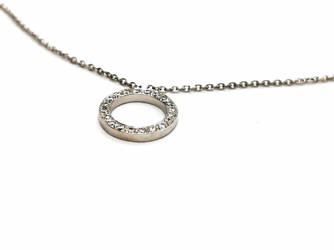 Necklace in 750 thousandths (18 carat) white gold, round pendant, set with 20 diamonds, brilliant cut G/VS, for approximately 0.20 ct in total, chain length: 50 cm with intermediate rings at 44.5 cm and 42 cm, chain width: 0.13 cm, pendant diameter: 1.38 cm, pendant width: 0.2 cm, total weight: 4.98 g, owl hallmark, excellent condition