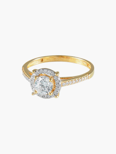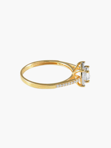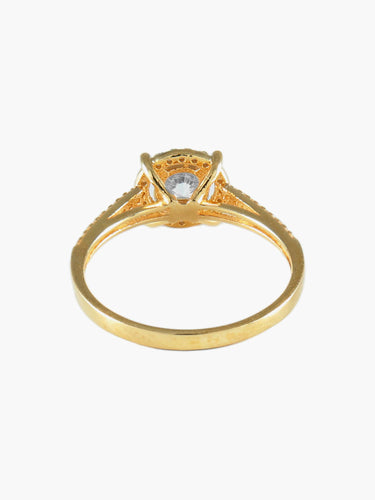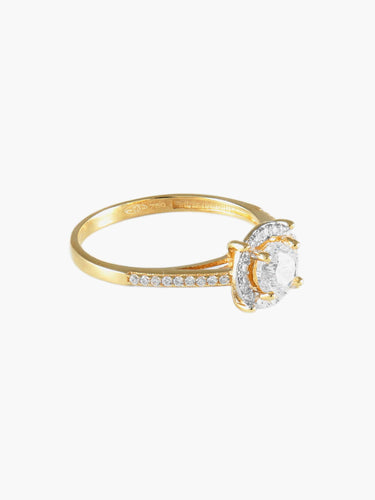 Prong-set 18-carat yellow gold wedding ring surrounded by synthetic zirconium oxides.