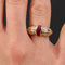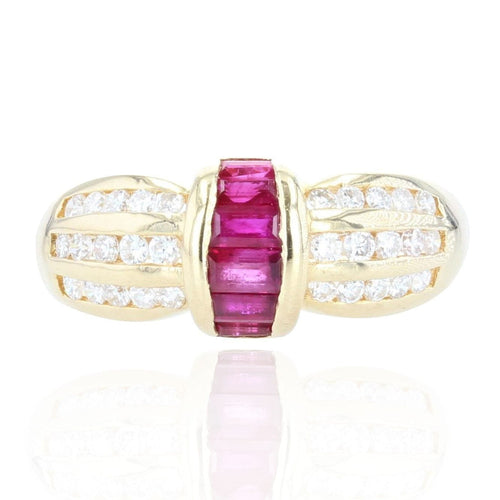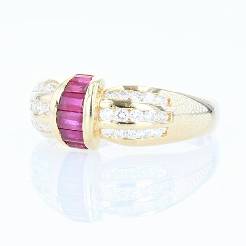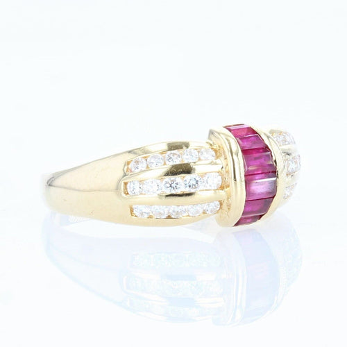 - Bangle-shaped ring, a link set with calibrated rubies adorns the top of this ring second-hand. On either side, 2 x 3 lines of modern brilliant-cut diamonds are present.