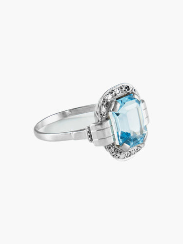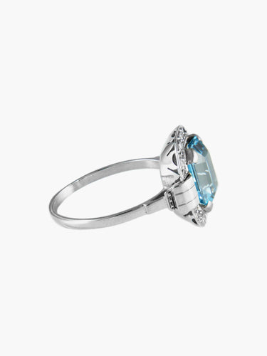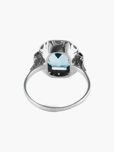 Old ring in 750/1000 white gold and platinum 850/1000 prong-set with a synthetic blue spinel using the Verneuil process (very common at the time), and 10 grain-set rose-cut diamonds. The ring head is made of platinum and the ring is white gold.