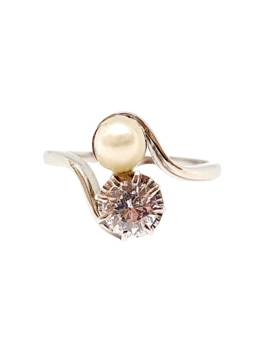 Toi & Moi diamond and pearl ring in platinum and white gold.