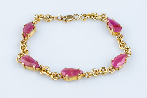 Bracelet in 14 ct yellow gold, adorned with 5 pear-shaped rubies of 1.04 cts each, or 5.20 cts in total.