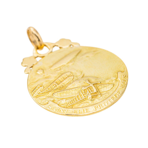 Pendant branded from the house of Becker in 750 thousandths yellow gold (18 carats), depicting Saint Elijah vs the Becker plane, dimensions with the bail: 2.45 cm x 1.96 cm, total weight: 4.03 g, eagle's head hallmark, excellent condition