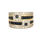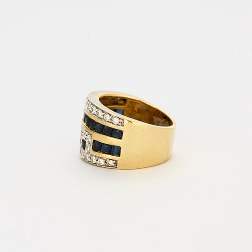 Large two-tone band ring in 18-carat (750/°°°) gold adorned with a geometric pattern alternating calibrated sapphires and brilliant-cut diamonds for an estimated weight of 2 and 0.40 carats respectively.