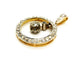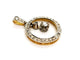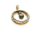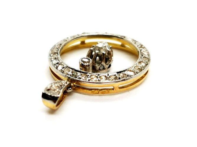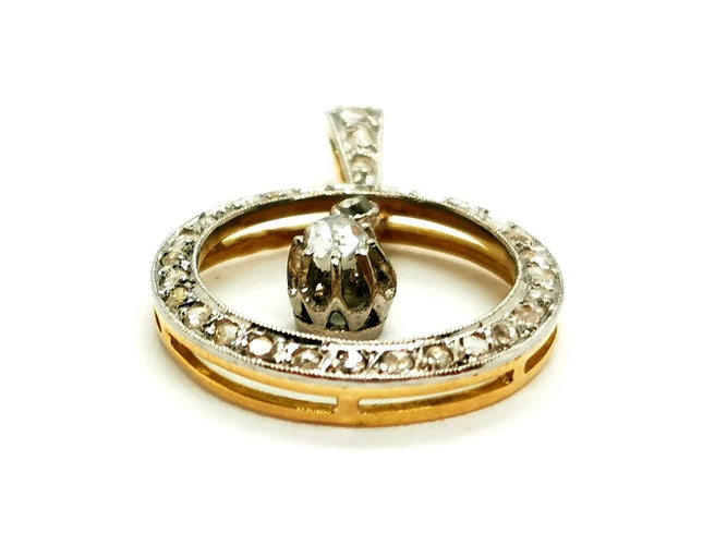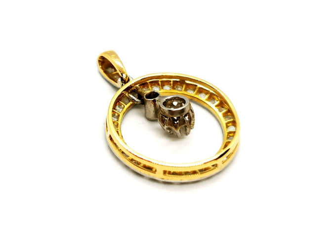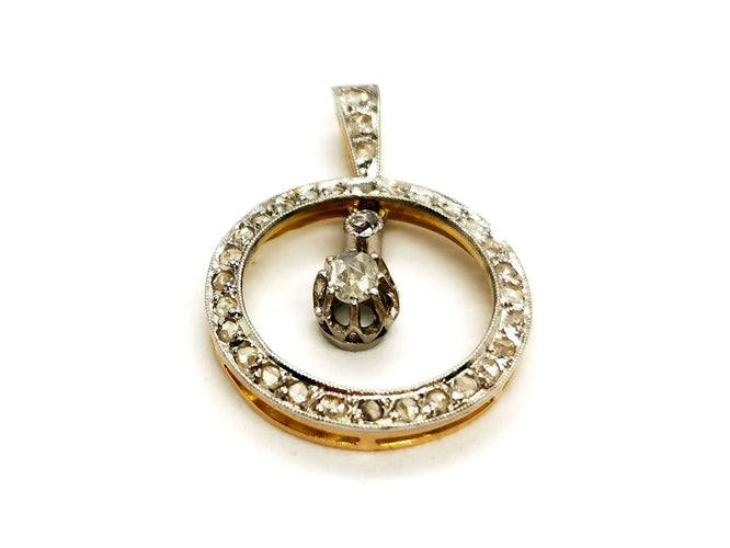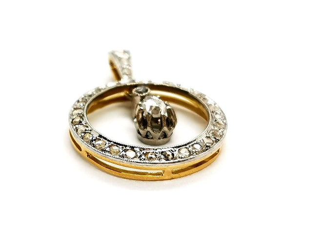Diamond pendant, in yellow gold and white gold 750 thousandths (18 carats), composed of a circle in yellow gold, set in white gold with 33 diamonds, including 28 rose-cut diamonds, approximately H/VS, for approximately 0.28 ct in total, in the center a pendant of 2 diamonds of approximately 0.015 ct and approximately 0.13 ct, the bail set with 3 diamonds for approximately 0.02 ct, total diamond weight: approximately 0.445 ct, dimensions (bail included): 2 .45 cm x 1.71 cm, total weight: 2.35 g, eagle head hallmark, excellent condition.