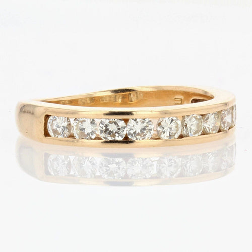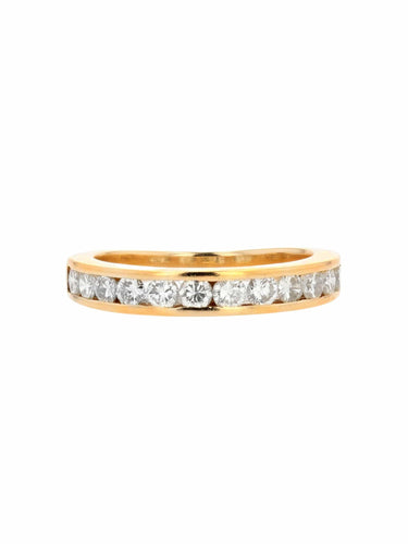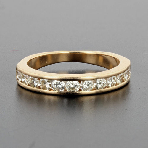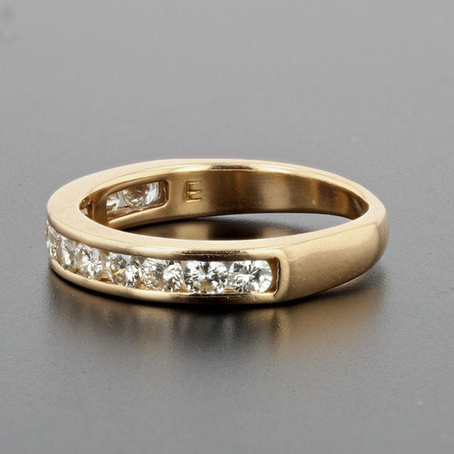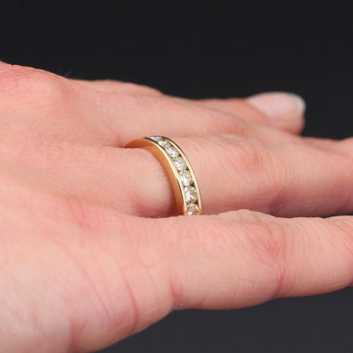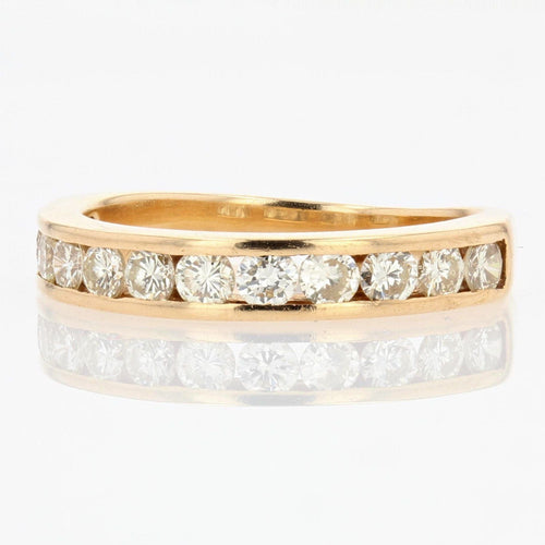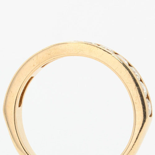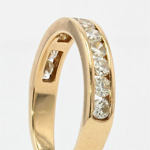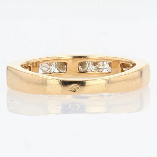 Ring in yellow gold, 750 thousandths, 18 carats, eagle's head hallmark. Half gold wedding ring, it is adorned on its top with 12 modern brilliant-cut diamonds in a rail setting.