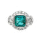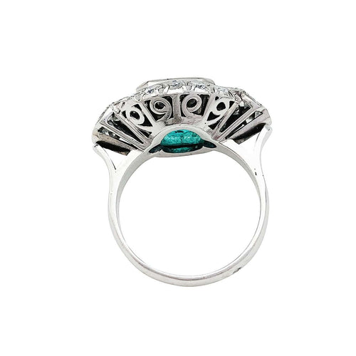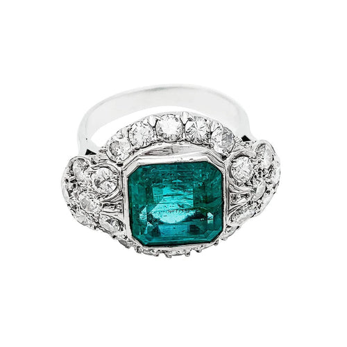 A ring Art Deco in platinum 950/000 set with a square cut emerald from Colombia enhanced with diamonds.