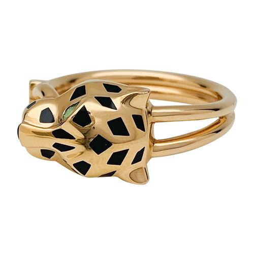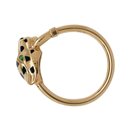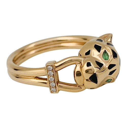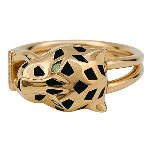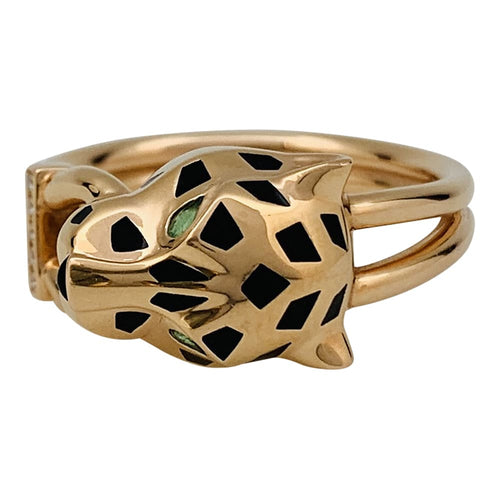 A ring branded of the House Cartier, collection "Panthère of Cartier", in 750/000 pink gold depicting a panther's head holding in its mouth a link decorated with 5 brilliant-cut diamonds. The spots are in black lacquer, the eyes in tsavorites.