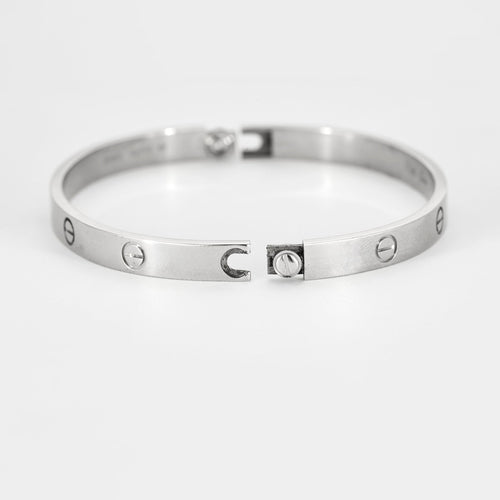 Opening bangle bracelet in 18K (750 thousandths) white gold chiseled with a stylized screw pattern.