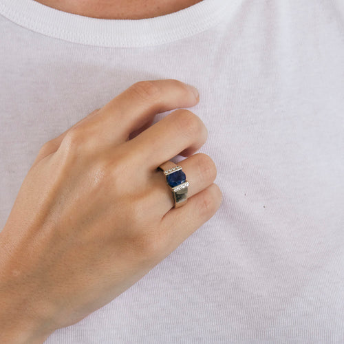 Important 18K (750 thousandths) white gold bangle ring centered with a faceted oval sapphire weighing approximately 2.30 carats bordered by two lines of small brilliant-cut diamonds measuring approximately 0.01 carat each. Openwork basket Trace of titling punch, trace of maker's mark.