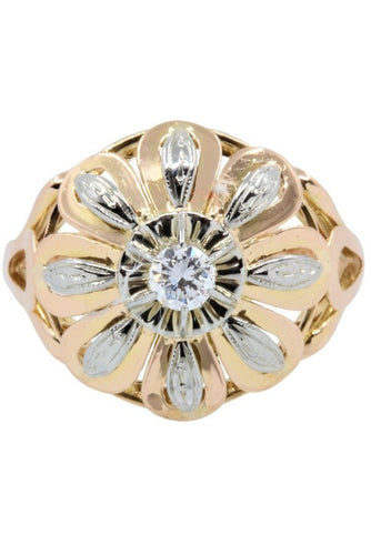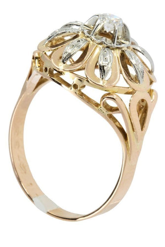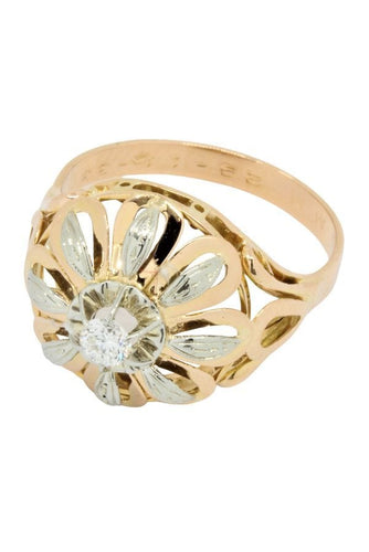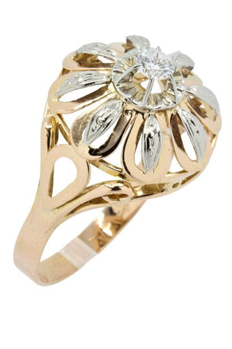 This ring from the 50s is set with a modern brilliant-cut diamond on an openwork decoration and supported by 8 white gold decorations.