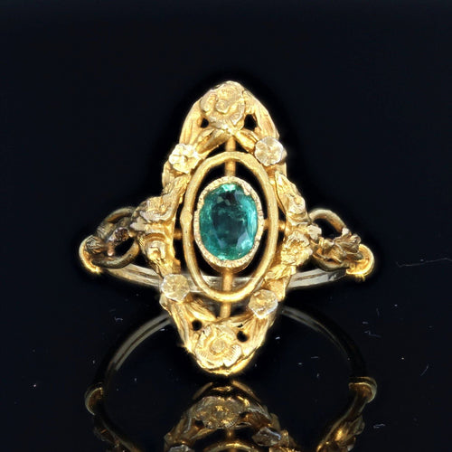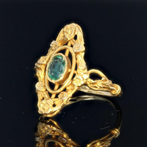 - Elegant old ring, it has an elongated setting, bezel-set with millegrains in the center of an emerald. The entire tray is chiseled with floral decorations which continue at the start of the ring.