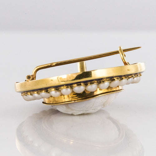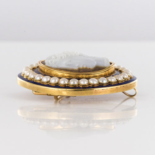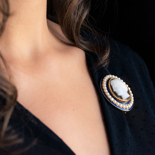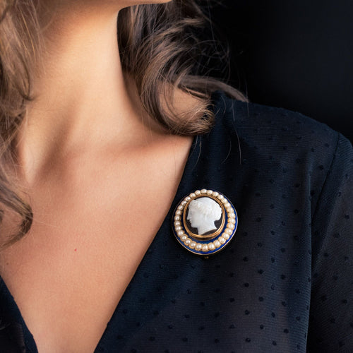 Brooch in yellow gold, 585 thousandths, 14 carats. It is set with a cameo on agathe representing the profile of a woman with raised hair surrounded by fine pearls all around its perimeter set on "big blue" enamel. The clasp is a pin. The brooch has a hook that allowed you to hang a watch.