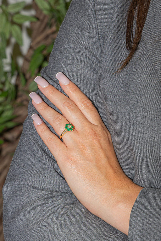 Ring set with a central diamond and emeralds, in 750 thousandths yellow gold (18 carats), 1 brilliant-cut diamond, approximately H-VS, weighing approximately 0.15 ct, surrounded by 6 round-cut emeralds, with a total weight of approximately 0.84 ct, (each emerald weighing approximately 0.14 ct), and 8 diamonds approximately H-SI, with a total weight of approximately 0.06 ct (each diamond weighing approximately 0.008 ct) width on the top: 1.13 cm, Ring size: 51, total weight: 3.84 g, eagle head hallmark, excellent condition
