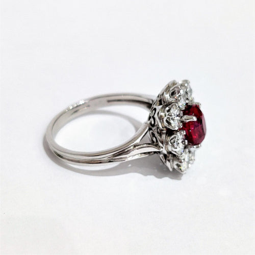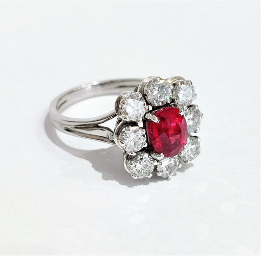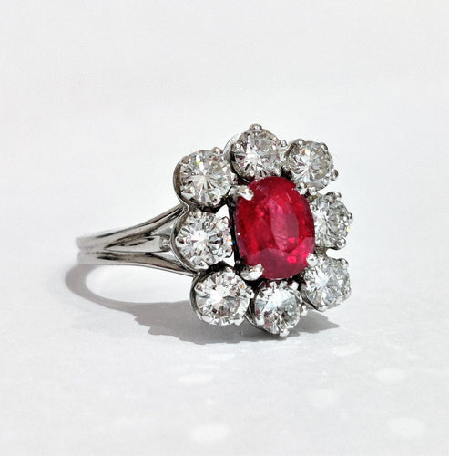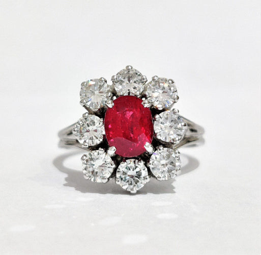 Beautiful ring Daisy in white gold adorned with a luminous oval ruby from Mozambique weighing 1.60ct surrounded by diamonds also weighing approximately 1.60ct. Nice work from the 70s.