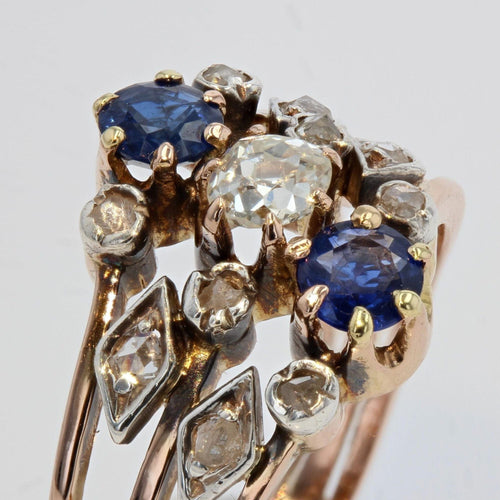 - Sublime and authentic old ring, it is set on 3 openwork rings, two round sapphires and an old cushion-cut diamond. On either side, on each of the rings, a rose-cut diamond is set, then two diamond patterns set with rose-cut diamonds. The three rings join at the base to form one and are separated in their upper part by 2x2 small gold pearls.