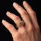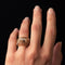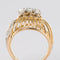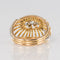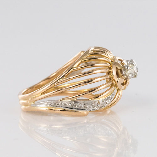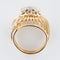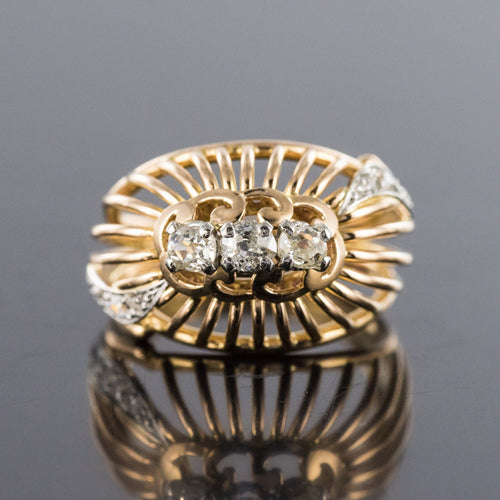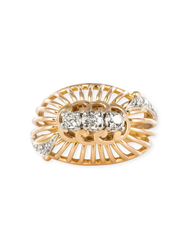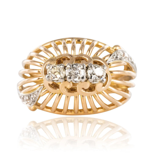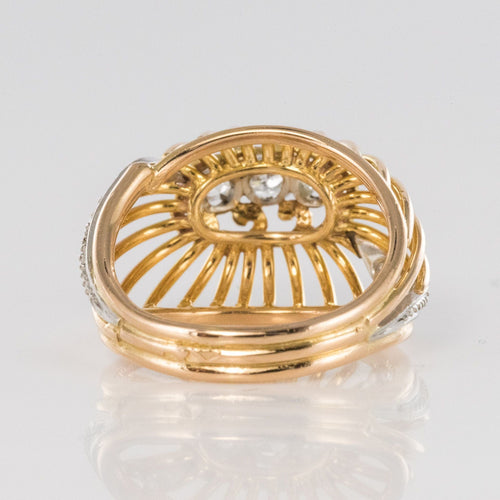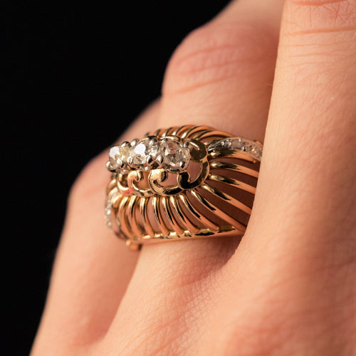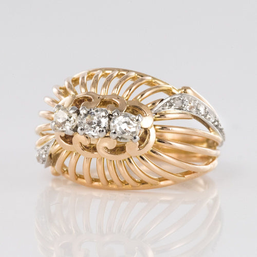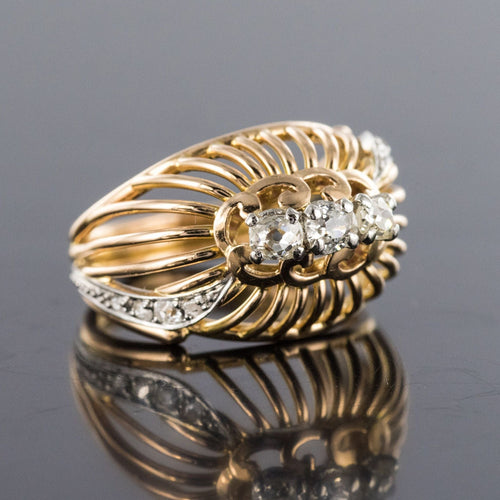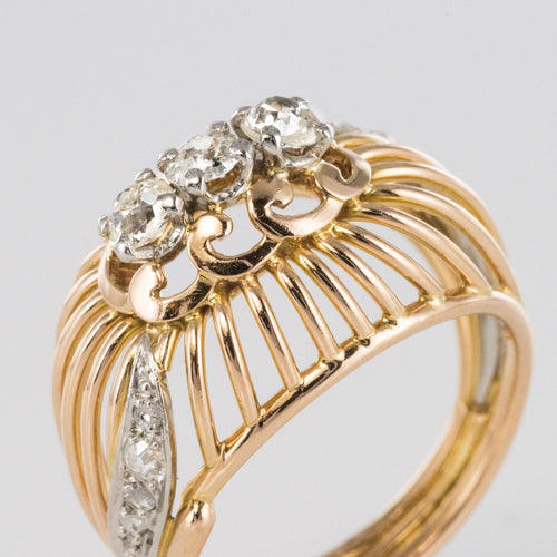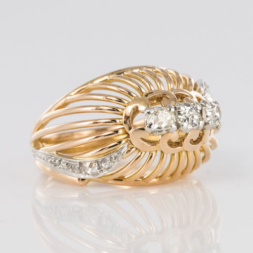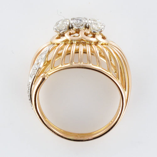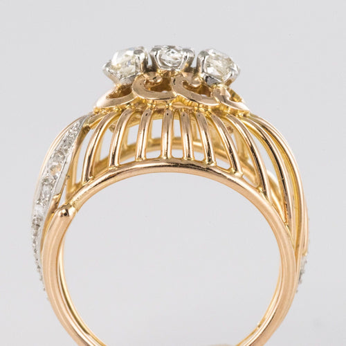 Ring in 750 thousandths yellow gold, 18 carats, eagle head hallmark, and platinum dog head punch. In accordance with its time, this vintage ring is formed of a gold wire setting which forms a dome, set on top with 3 diamonds on platinum. On either side are set with 2x3 diamonds in a wave pattern.