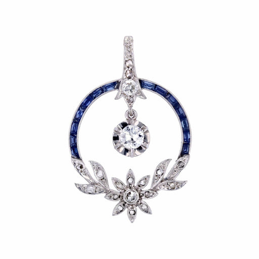 - A delightful antique piece of period jewelry, it is round in shape, openwork and decorated on three quarters of its curve with a line of calibrated sapphires in millegrain settings. On the front, a floral motif is set in applique and decorated with rose-cut diamonds. The bail is formed by a fleur-de-lys motif, set with rose-cut diamonds and an old-cut diamond. It supports as a tassel, within the circle of sapphires, an old brilliant-cut diamond held in claws of a larger size.