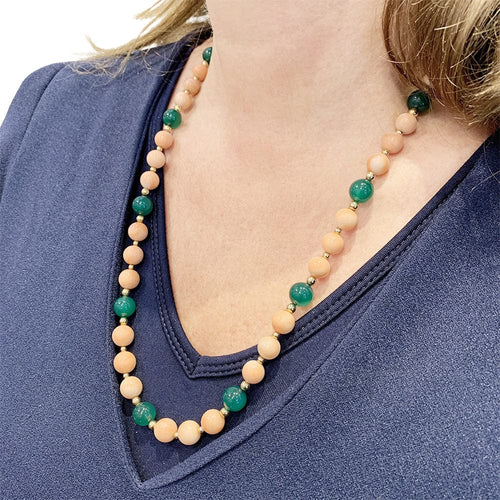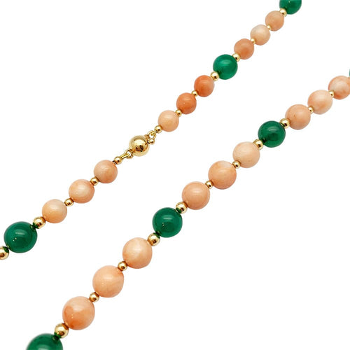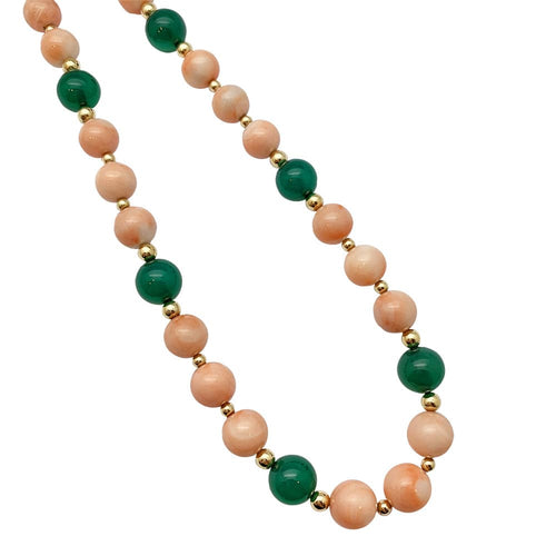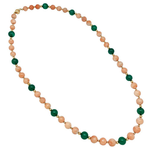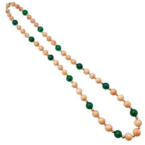 A vintage necklace composed of coral balls, chrysoprase and 750/000 yellow gold spacers. 750/000 yellow gold clasp.