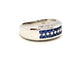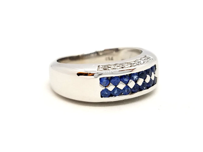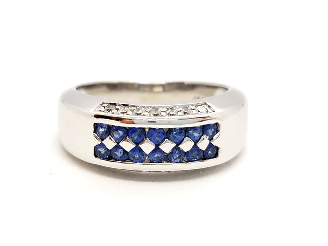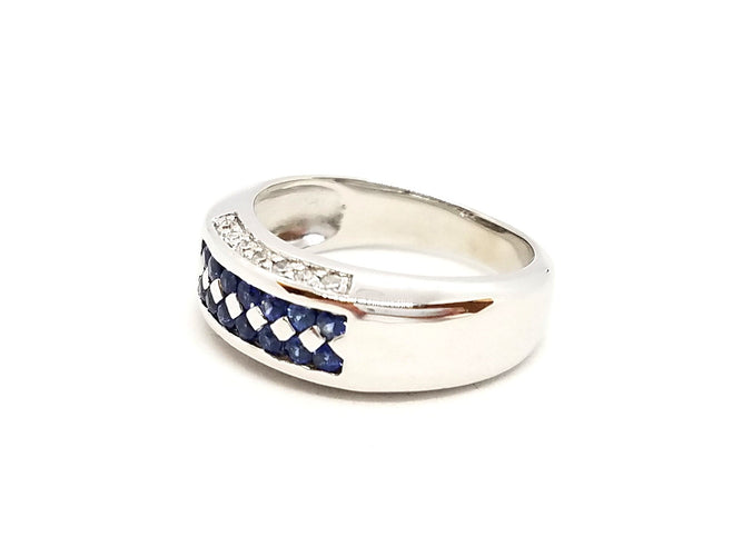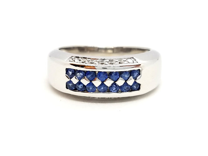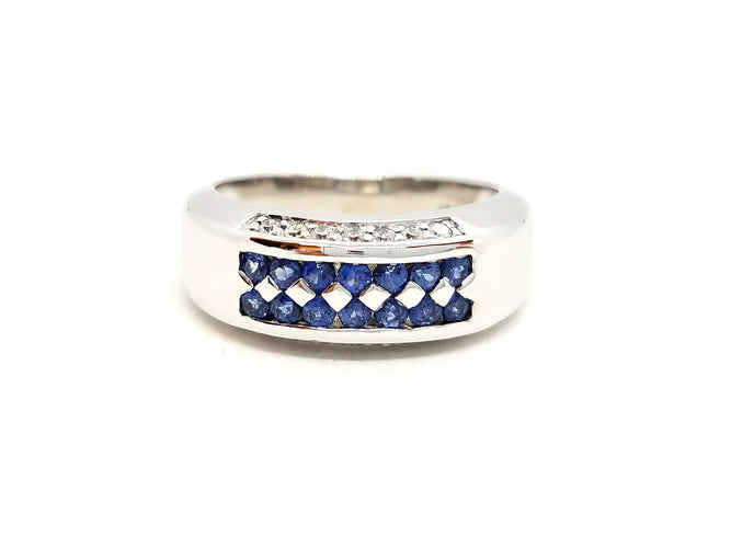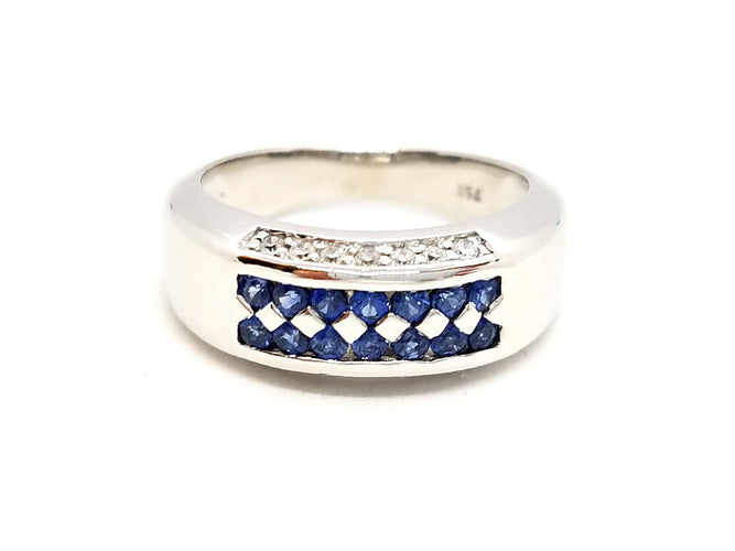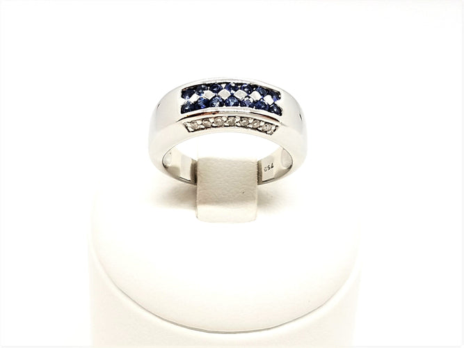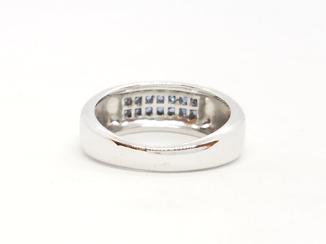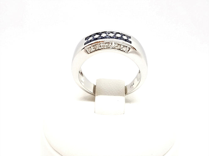 Ring in 750 thousandths (18 carat) white gold, paved on the edges with 14 GH VSI brilliant-cut diamonds for approximately 0.10 ct in total, and on top with 14 round sapphires for approximately 0.14 ct in total.