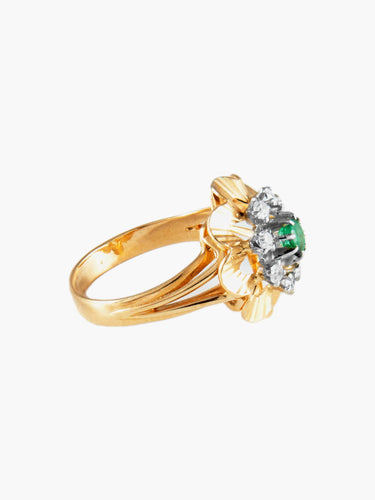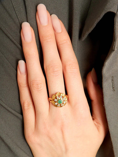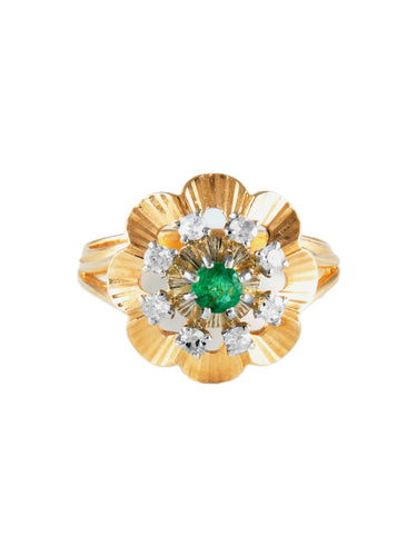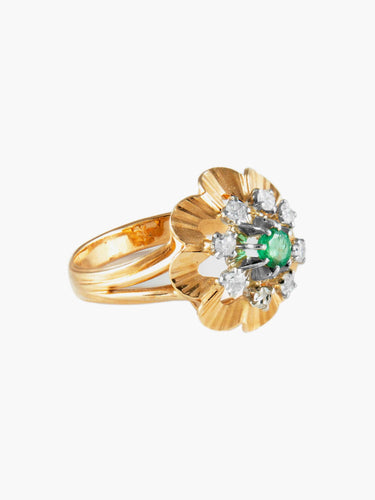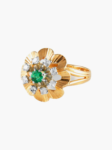 Antique ring in 750/1000 yellow gold and white gold claw-set with a natural emerald surrounded by a crown of 8 claw-set diamonds in white gold, in a striated collar in yellow gold.