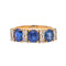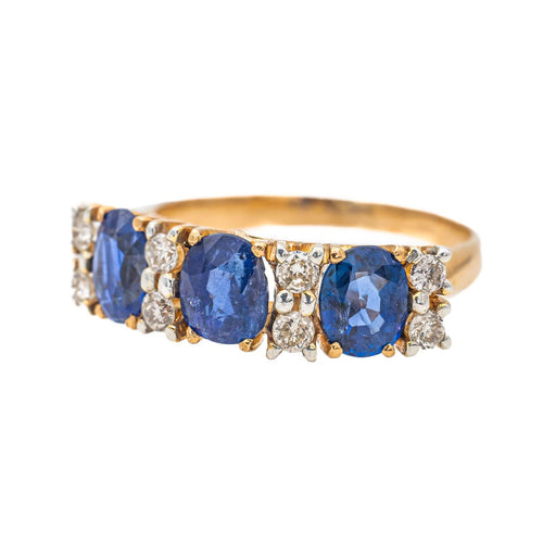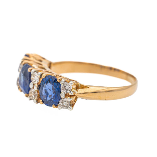 Ring in 750 thousandths (18 carat) pink gold, set with sapphires and diamonds, 3 oval-cut sapphires, with a total weight of approximately 2.43 cts (each sapphire with a weight of approximately 0.81 ct), surrounded by 8 brilliant-cut diamonds, approximately H-SI, with a total weight of approximately 0.08 ct, (each diamond with a weight of approximately 0.08 ct), total weight of diamonds approximately: 0.08 ct, width on the top: 2.03 cm, Ring size : 51, total weight: 3.56 g, owl hallmark, excellent condition