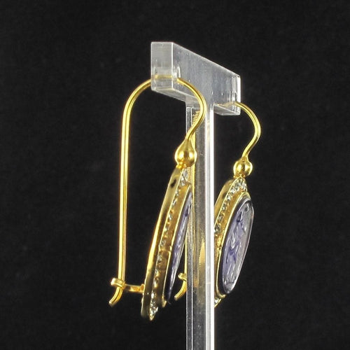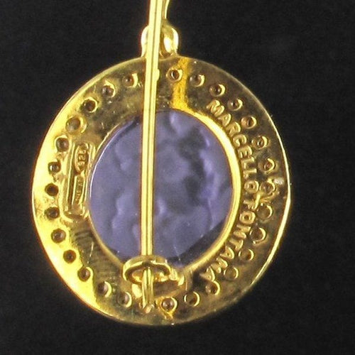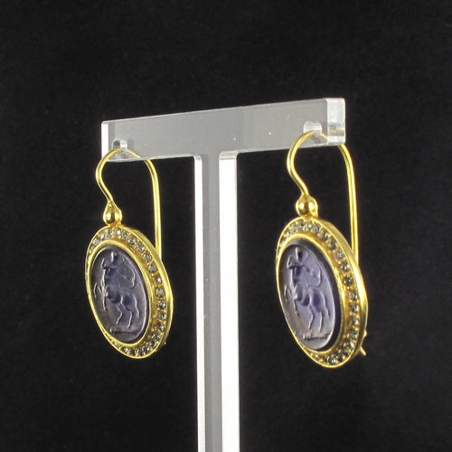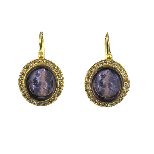 - Round in shape, they are each set in a closed setting, with a cameo on glass paste representing a centaur bordered all around with small crystals