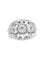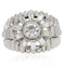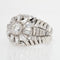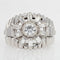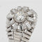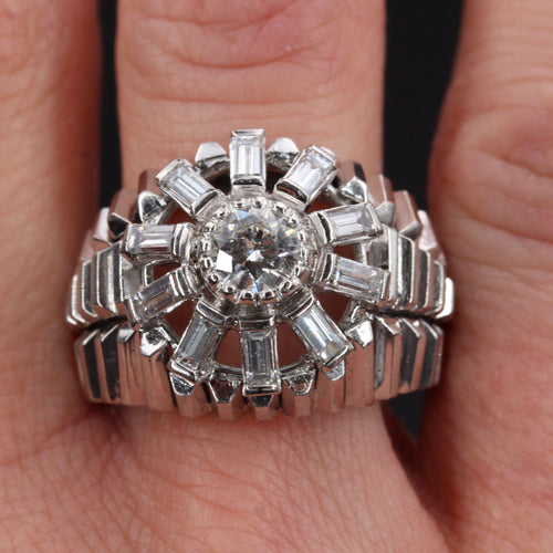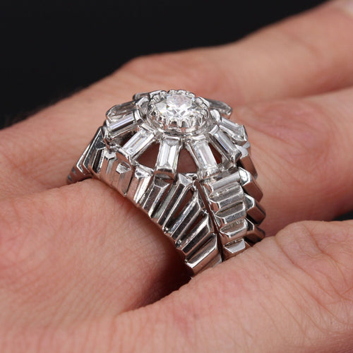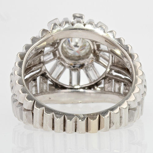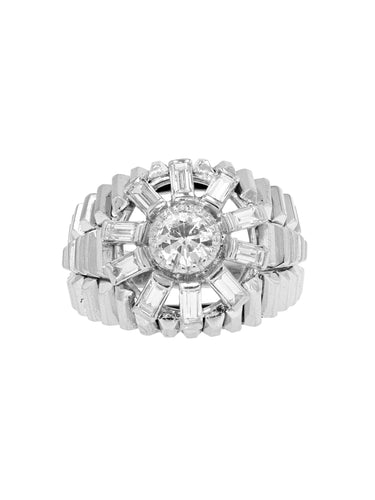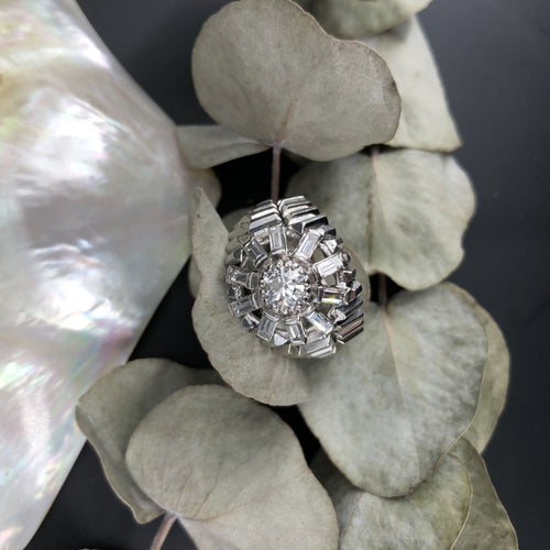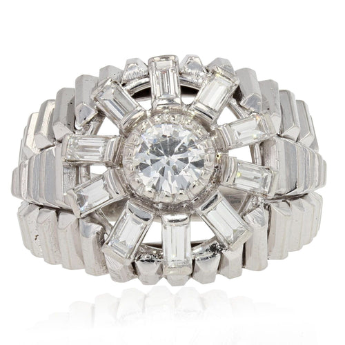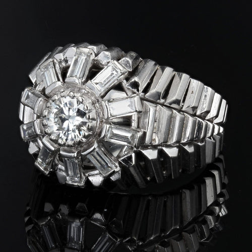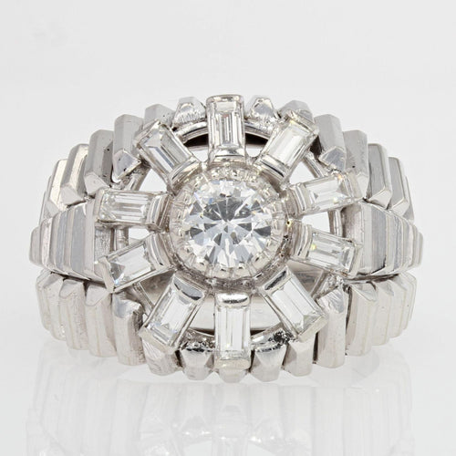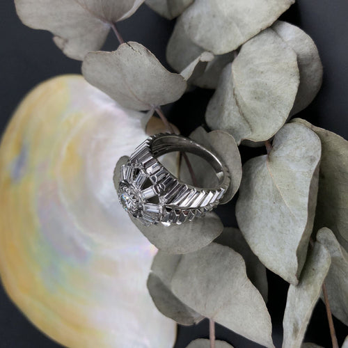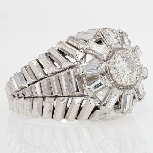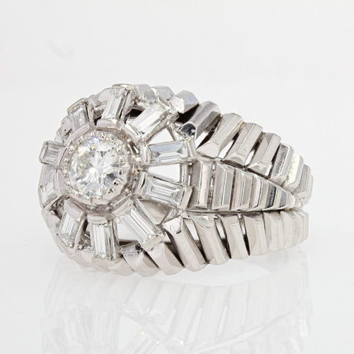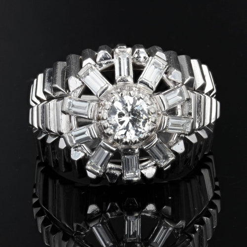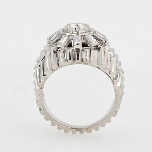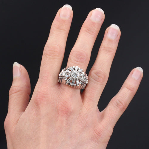 White gold ring, 750 thousandths, 18 carats, owl hallmark. Important dome ring, its setting is made up of a triple row of openwork prism motifs between them. The top is bezel-set with an old brilliant-cut diamond in an openwork surround of baguette-cut diamonds.
