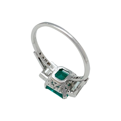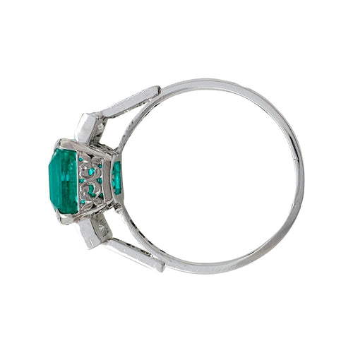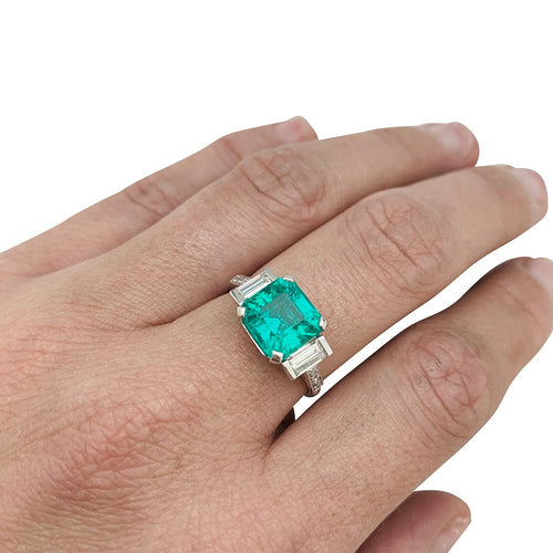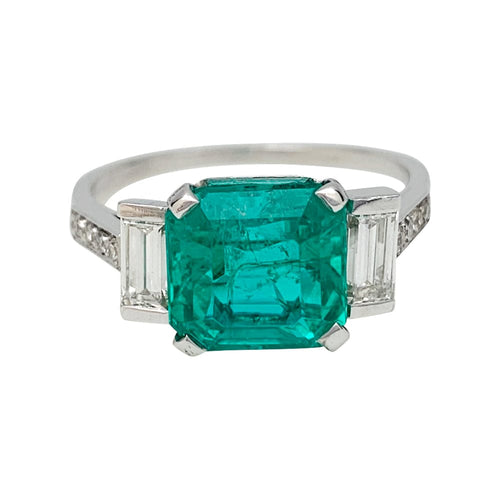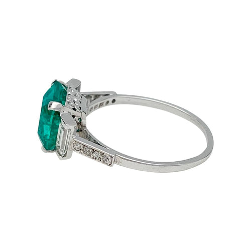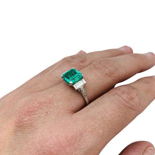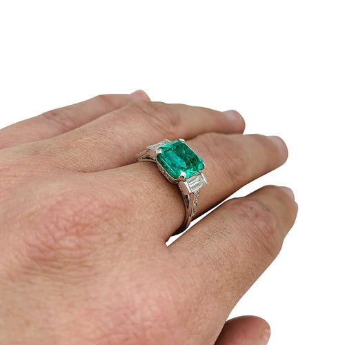 A ring in platinum 950/000, centered with an emerald-cut emerald with cut sides weighing 2.81 carats, supported by two baguette-cut diamonds. The setting is enhanced with 8/8 cut diamonds on the palmettes.