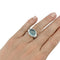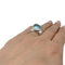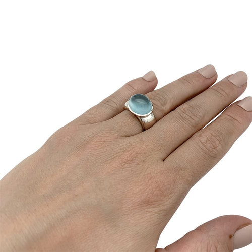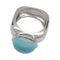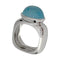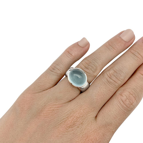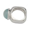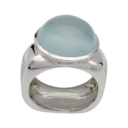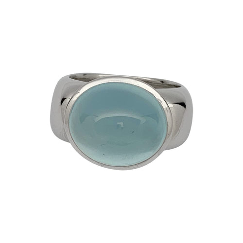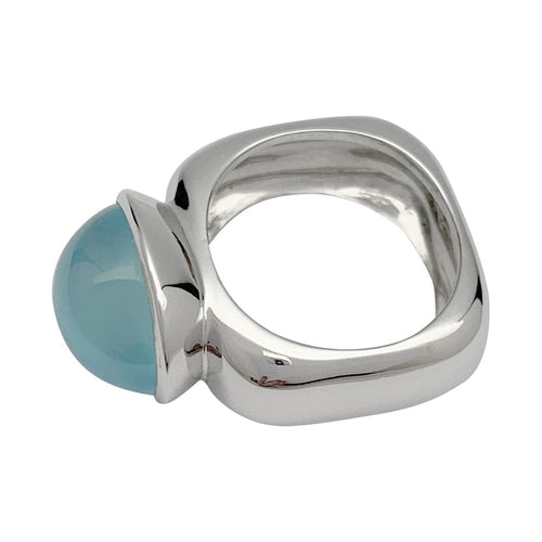 A square ring in 750/000 white gold set with an aquamarine cabochon.