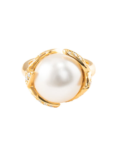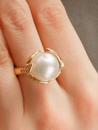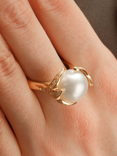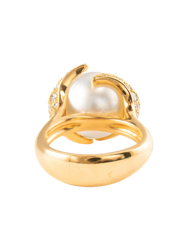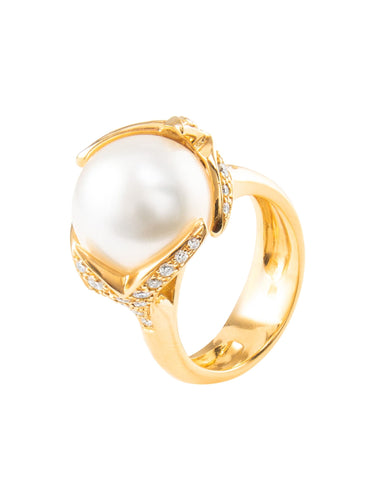 Yellow gold ring, adorned with a beautiful South Sea pearl surrounded by 38 diamonds.