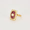 Ring in 18K (750 thousandths) yellow gold composed of a central round brilliant-cut diamond in a closed setting calibrating approximately 0.20 carat surrounded by calibrated rubies and round brilliant-cut diamonds in a pearl setting. The openwork basket with a scroll motif. French work.