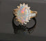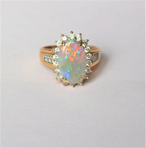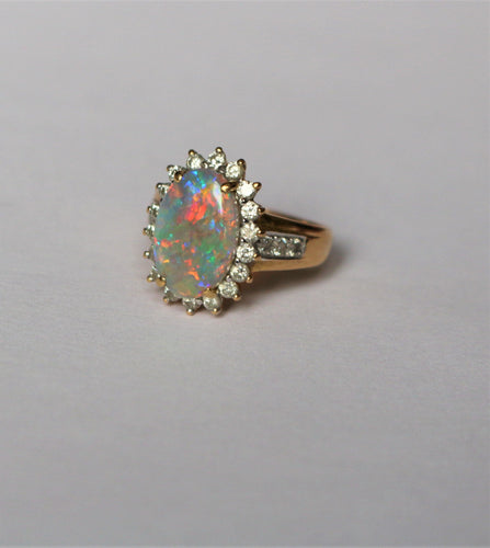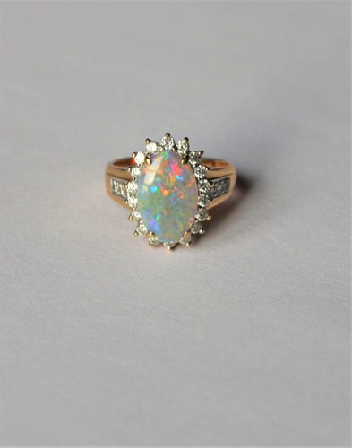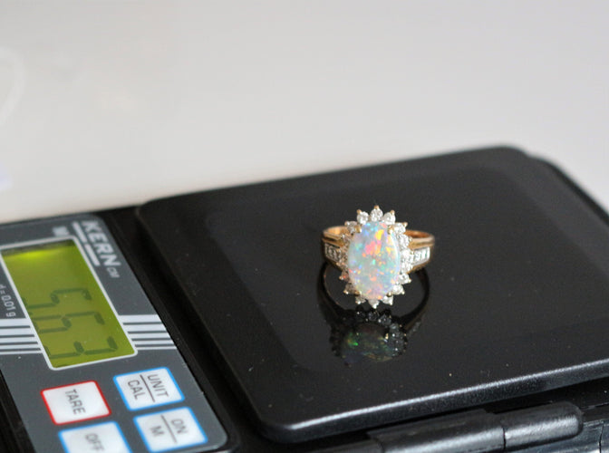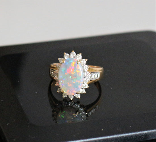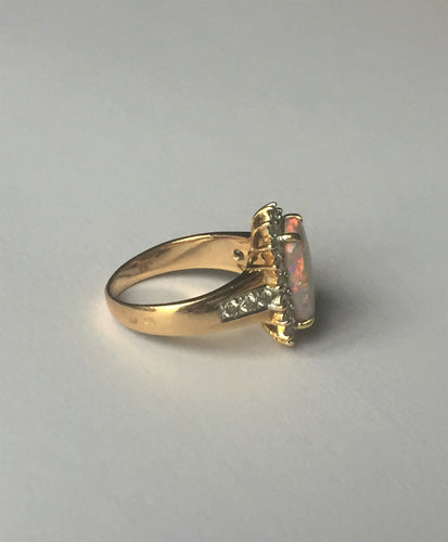 Beautiful Pompadour ring in 18k yellow gold (eagle's head and goldsmith hallmark on the outer ring DM) topped with an oval opal in an entourage of diamonds (6 on the sides + 18 around the opal)