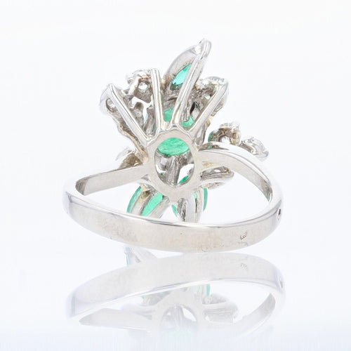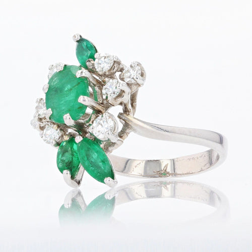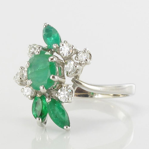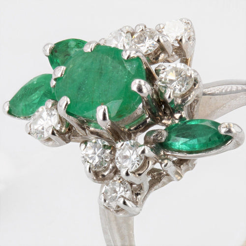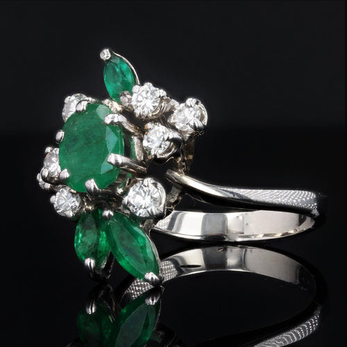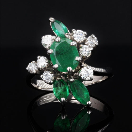 - Coming straight from the 1970s, this stunning vintage ring is prong set with an oval emerald surrounded by 8 modern brilliant cut diamonds and 3 shuttle emeralds all prong set.