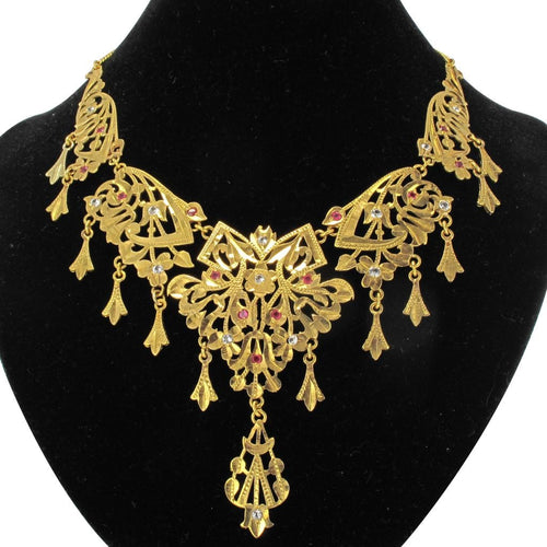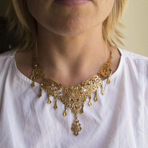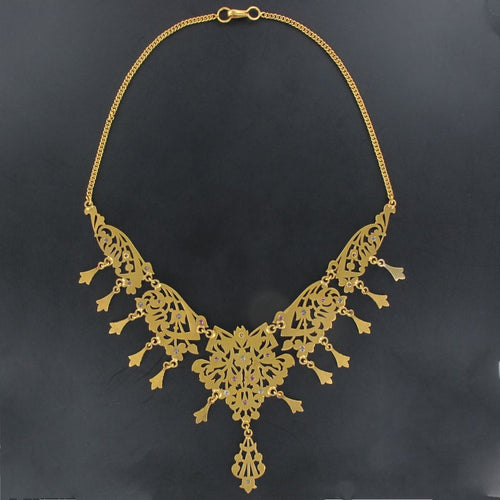 - Imposing, this vintage necklace is made up of 5 gold plates articulated together, openworked with arabesques, plant decorations and finely chiseled.