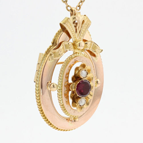 - Oval in shape, this brooch has a flower motif in its center set with a garnet in the center and on either side with fine half-pearls. All on an openwork decor. It is topped with a chiseled ribbon and its surroundings are bordered with a fine cord. The attachment is a pin and the old brooch has a hook to wear it as an old pendant.