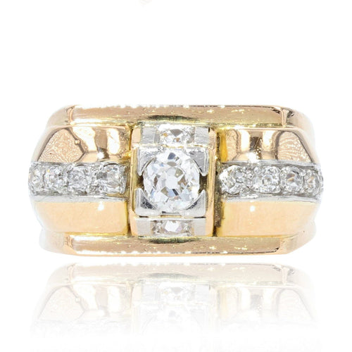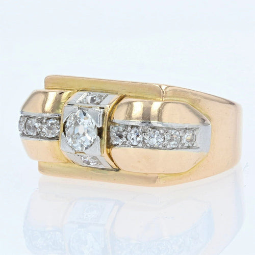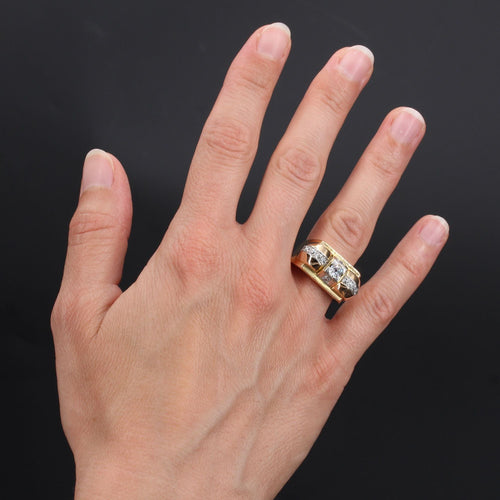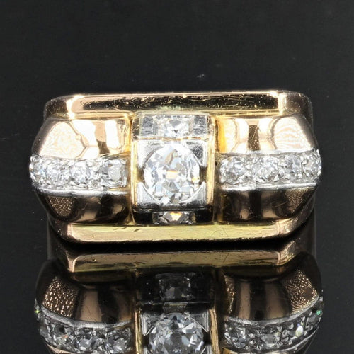 - Magnificent ring tank, it has in the center an old brilliant-cut diamond supported by two old-cut diamonds with, on either side, a domed movement set with 2 x 5 brilliant-cut diamonds.