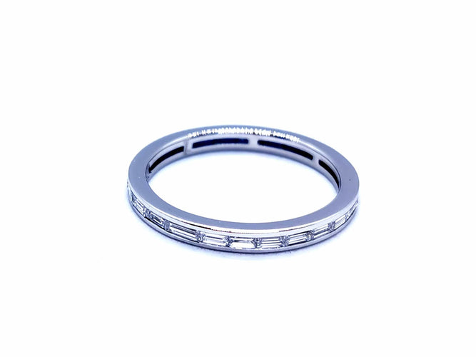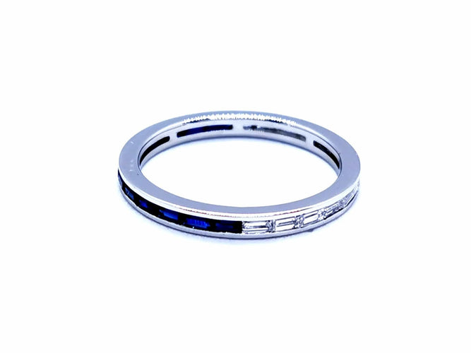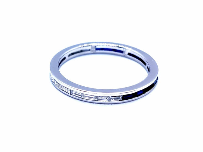 Full ring wedding ring, in tested 750 thousandths (18 carat) white gold, set with 13 GH VSI baguette diamonds for approximately 0.39 ct in total, and 13 baguette sapphires for approximately 0.39 ct in total.