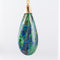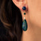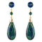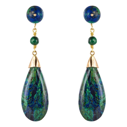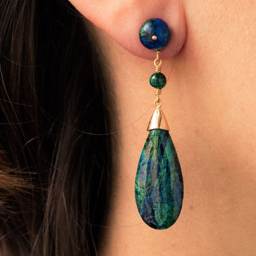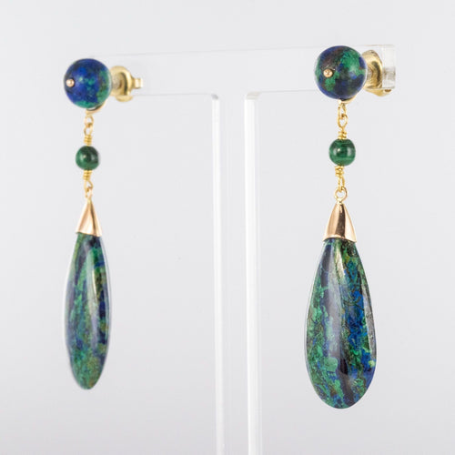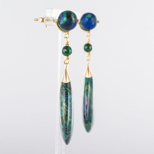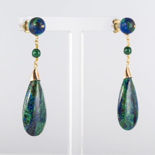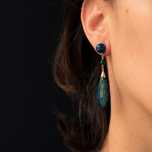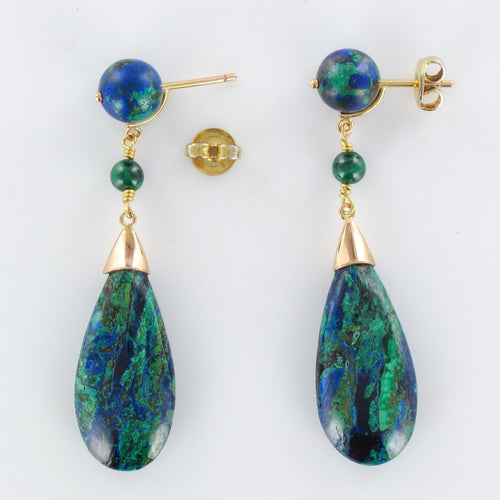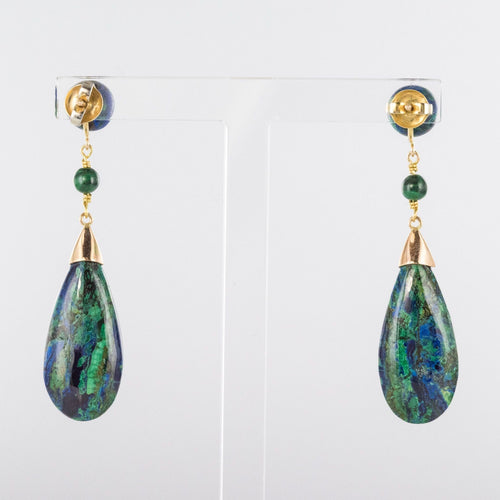 Creation Balm - Piunique era. Earrings in yellow gold, 750 thousandths, 18 carats. Long pendant earrings, each is made up of an azurmalachite pearl pierced with a gold nail which holds a malachite pearl as a tassel, itself supporting a flat drop of azurmalachite. The clasp is a large butterfly.