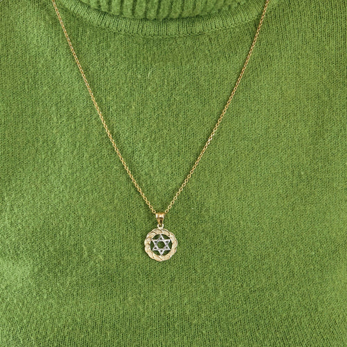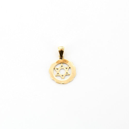 A 750/1000 yellow and white gold pendant representing the Star of David surrounded by a circle with swirl effect granulated patterns.